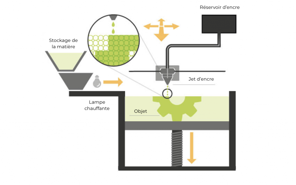 Le MJF est une technologie proche du SLS, mais le principe de fusion diffère. Au lieu d’un laser, des agents liquides sont déposés sur la poudre afin de définir les zones à fusionner. Une source de chaleur vient ensuite solidifier l’ensemble.