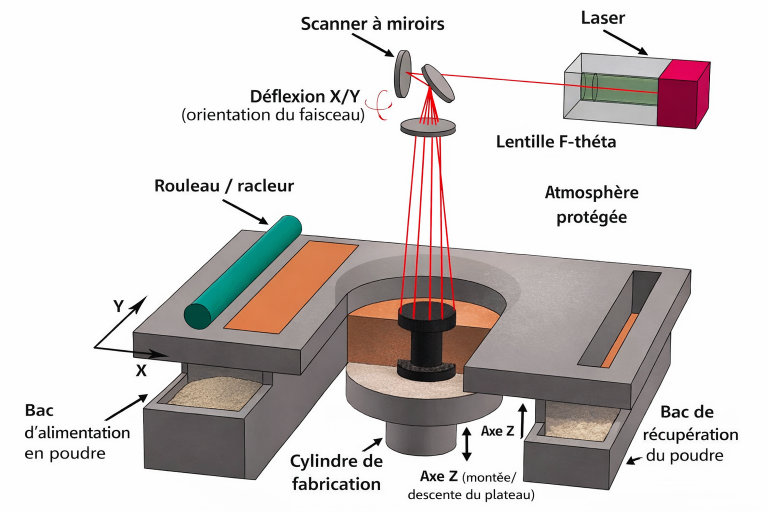 Le procédé SLS fonctionne à partir d’un lit de poudre plastique, généralement du nylon. Un laser, orienté par des miroirs, vient fusionner la poudre uniquement aux endroits correspondant à la pièce. La poudre non fusionnée reste en place et sert naturellement de support pendant l’impression.